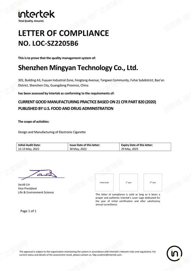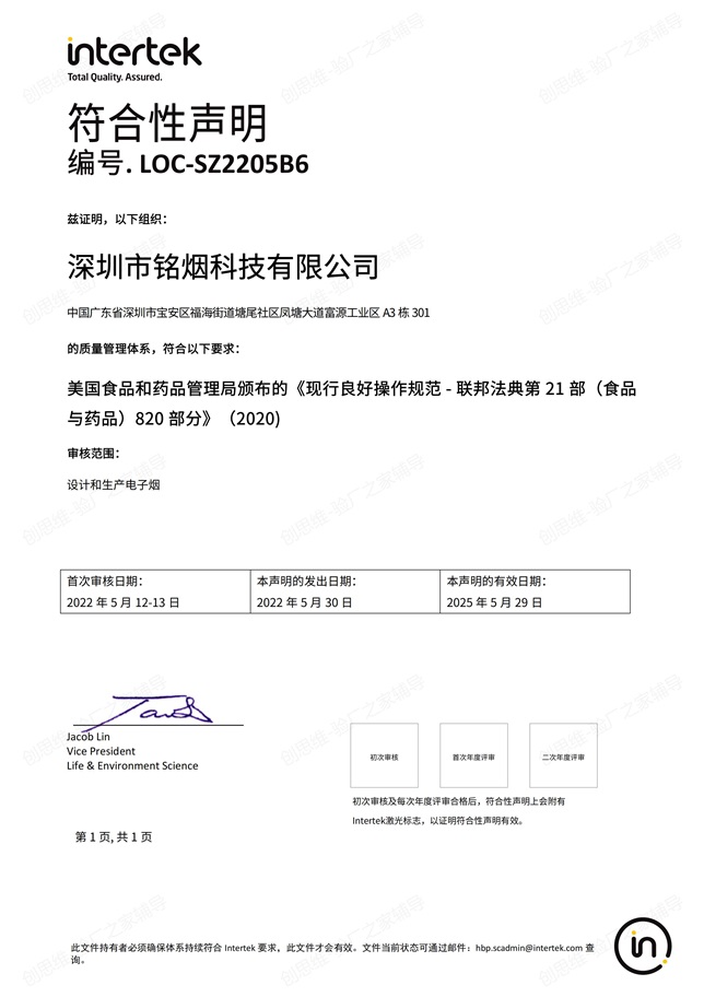 2022年5月12日-13日,國際認證機構INTERTEK(ITS) 專家及深圳市創(chuàng)思維企業(yè)管理技術有限公司技術經理、GMP輔導老師一起,對深圳銘煙電子煙、電子霧化器生產基地、煙油灌裝車間、包裝車間、成品倉庫、更衣室、化學品倉等進行了GMP 820認證現場檢查。經過2天嚴格、細致的檢查,順利通過檢查,并取得GMP-820認證證書。