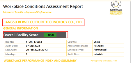 在創思維驗廠網老師專業技術、全程跟進耐心細致輔導以及公司全體員工配合下,一次性順利通過ITS-WCA驗廠,為將來公司發展奠定了良好的發展基礎,既開拓了市場同時也增加了消費者對公司的信賴,在這里再次祝賀江蘇百威文化科技有限公司2023年一次性成功通過ITS-WCA驗廠,同時也期待未來再次與創思維驗廠網合作!